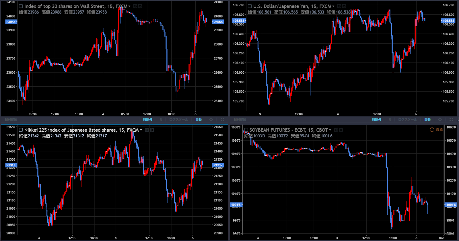 ※左上ダウCFD、左下日経CFD、右上ドル円、右下 報復関税で話題の大豆